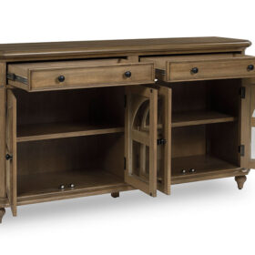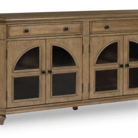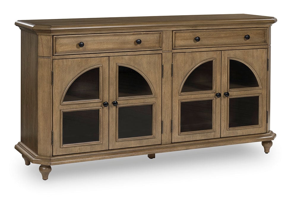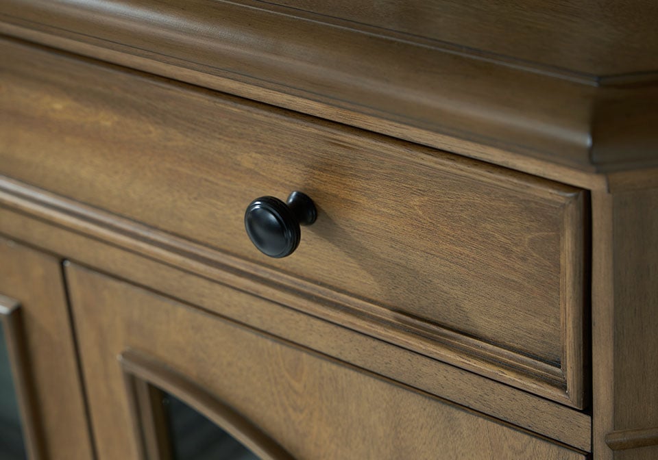 This lovely accent cabinet is a masterful blend of classic charm and practicality. A light brown finish and arched glass panel doors create a timeless look, while the spacious drawers and adjustable shelves offer versatile storage options. Convenient openings in the back for electronics keep those ugly cords out of sight.