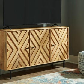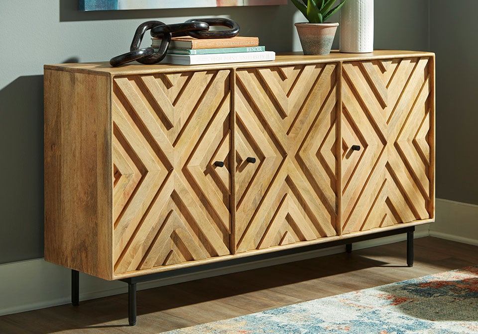 Your search for simple, chic design ends here. A versatile stunner, this accent cabinet adds a sophisticated aesthetic with diamond-patterned drawer fronts and a warm natural finish. It’s gorgeous and ready to serve as a buffet or console.