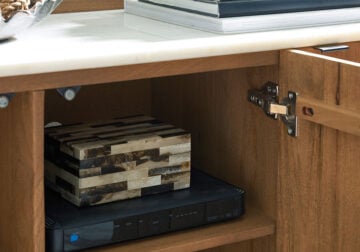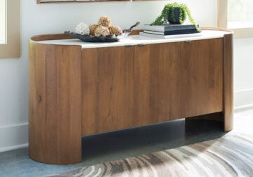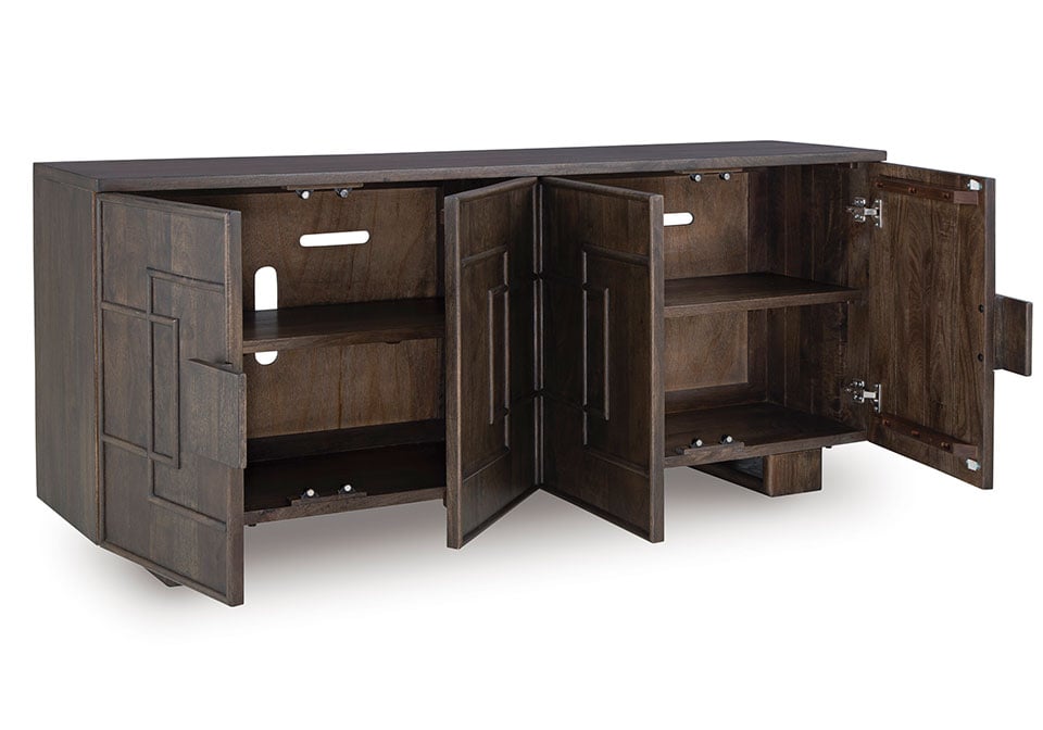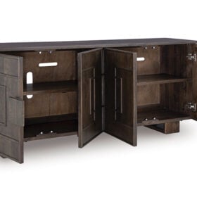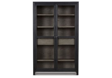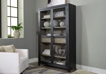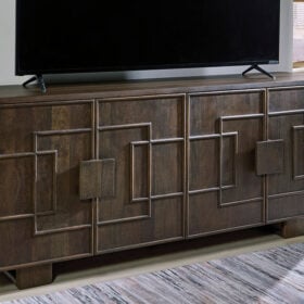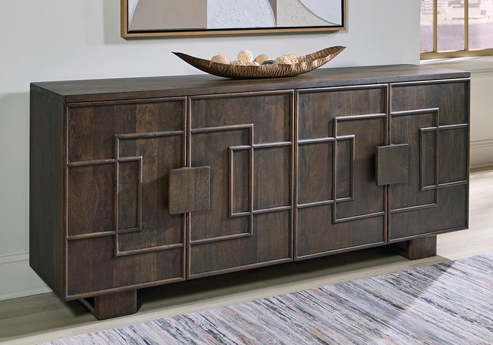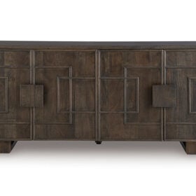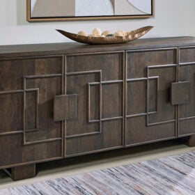This accent cabinet is a stunning statement piece that combines artistry and functionality. A beautiful dark brown finish and raised geometric-patterned door fronts create a captivating look, while the spacious interior with two shelves offers ample storage. It’s a perfect place to keep your essentials organized and out of sight.