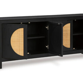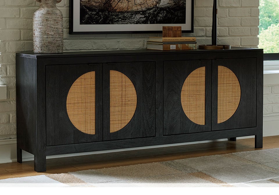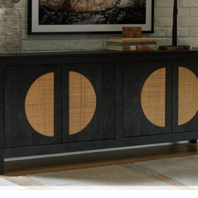 Bring high style and functionality to your home with this contemporary accent cabinet. Woven cane door fronts and a contrasting black finish bring the wow factor to this mid-century inspired piece. Whether it suits your storage needs in the dining room, home office or entryway, it’s quite a showpiece.