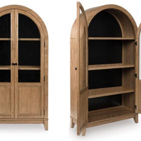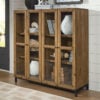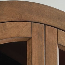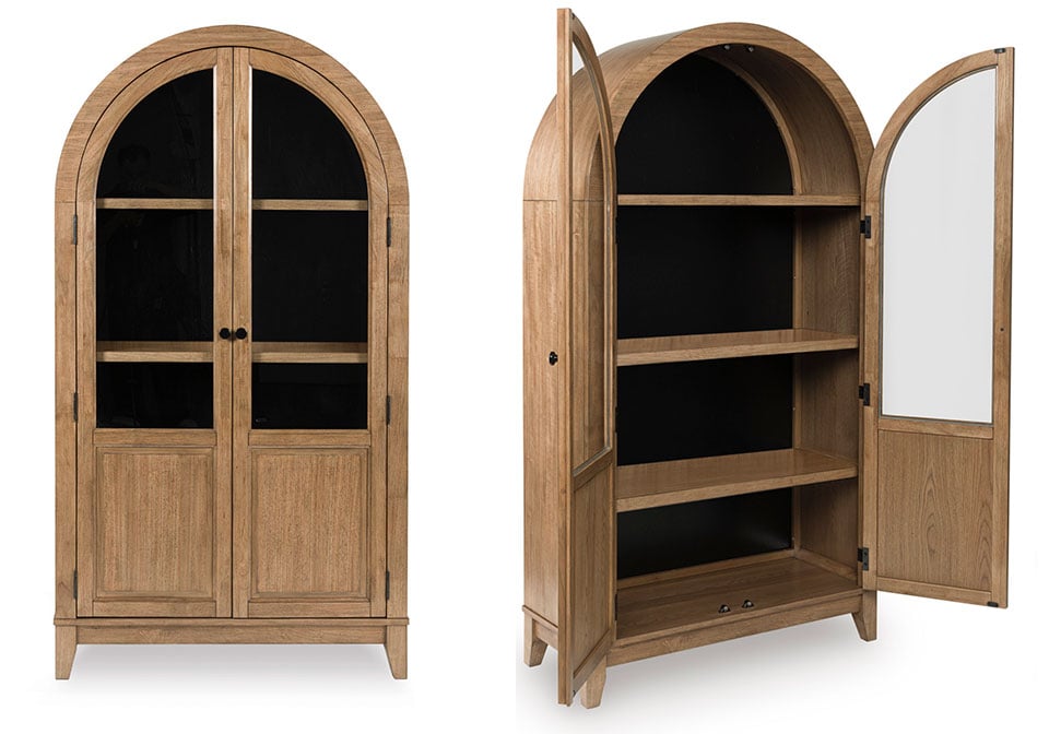 This accent cabinet is a stunning marriage of architectural intrigue and sophisticated storage. Its glass-paneled doors and natural wood tone create an inviting warmth well-suited to transitional spaces. Ideal for showcasing fine china or storing everyday essentials, this versatile piece proves that practical storage can be utterly beautiful.