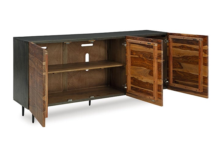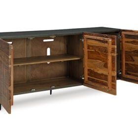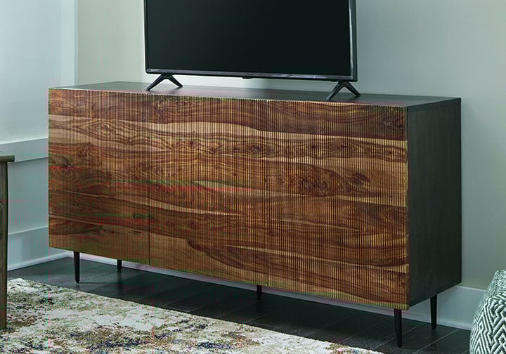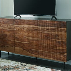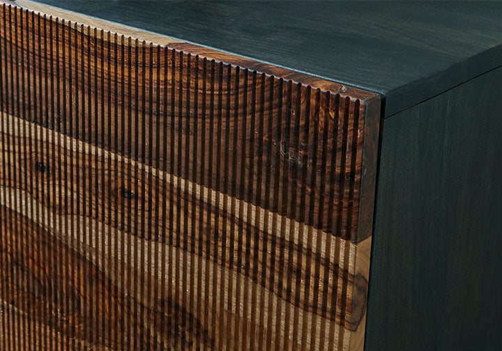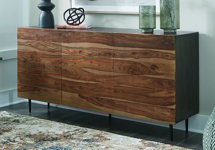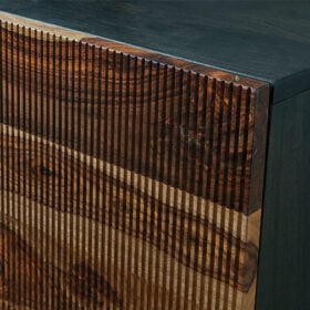 This mid-century modern inspired piece is skillfully crafted with durable solid mango and shesham wood. The natural and deep brown finish in addition to the fluted, grooved door fronts provide character anywhere it’s displayed. Pair it with sumptuous velvet upholstery and accents in a brushed brass-tone finish for an exquisite look.