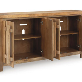 Say hello to style and bid farewell to clutter without compromising on design. This accent cabinet radiates refined modern craftsman influence. Impressive detailing and cabinets with dynamic oversized wooden pulls create organic appeal. Offering ample storage space for your essentials, don’t just organize your home—artfully arrange it.