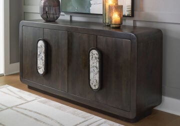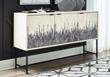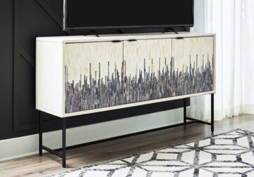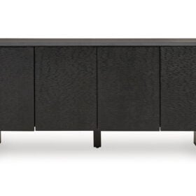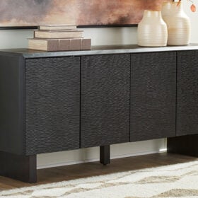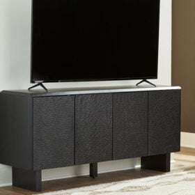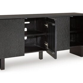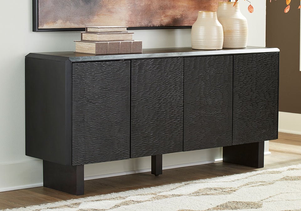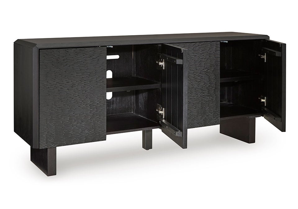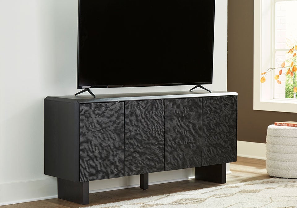 Function and style merge perfectly with this accent cabinet. Crafted of solid wood in a black finish, this piece makes a great case for fresh contemporary design. Doors with a carved pattern open to reveal shelving, while beveled edges add a distinctive touch. Whether you use it for storage or as a TV stand, your love of unique style will shine front and center.