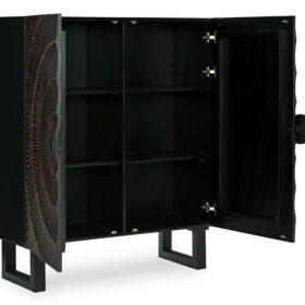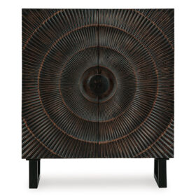 High style is on the rise with this wood accent cabinet. Its stunning doors, graced with a carved sunburst pattern and oversized wood pull, open to reveal two shelves. A distressed black finish adds contemporary flair. Whether this cabinet is accommodating storage needs or hiding clutter, it’s truly a showpiece.