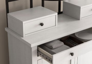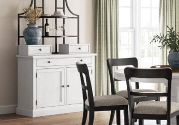 Relaxed living and cozy comfort—that’s what traditional farmhouse design is all about. And what better way to embrace your love of rustic country style than with this baker’s rack. Celebrating the beauty of simplicity, its ample drawers and shelving marry functionality with classic appeal for a fresh feel. Spacious cabinets invite endless hideaway possibilities, while the black metal hutch adds casual charm.