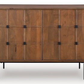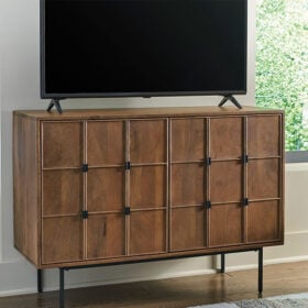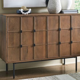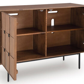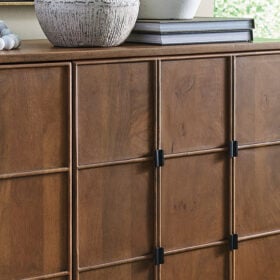 A step above the rest, this accent cabinet is so alluring and versatile. Push magnet doors with a captivating carved grid design open to reveal two interior shelves, keeping you organized in the most casually cool way.