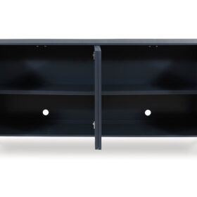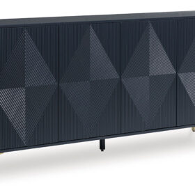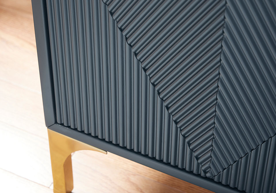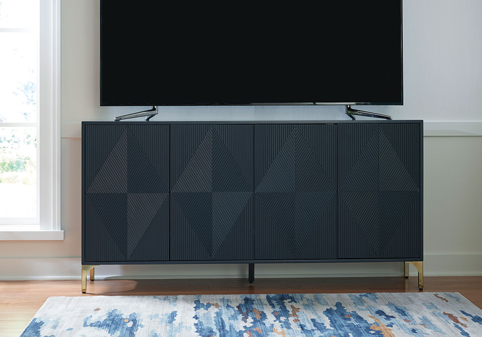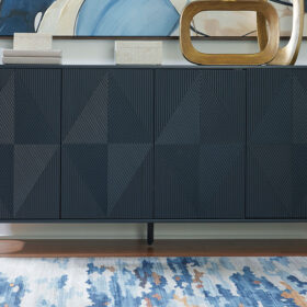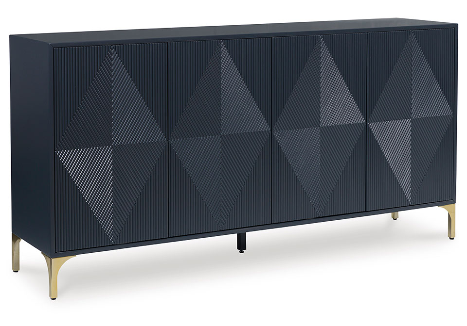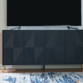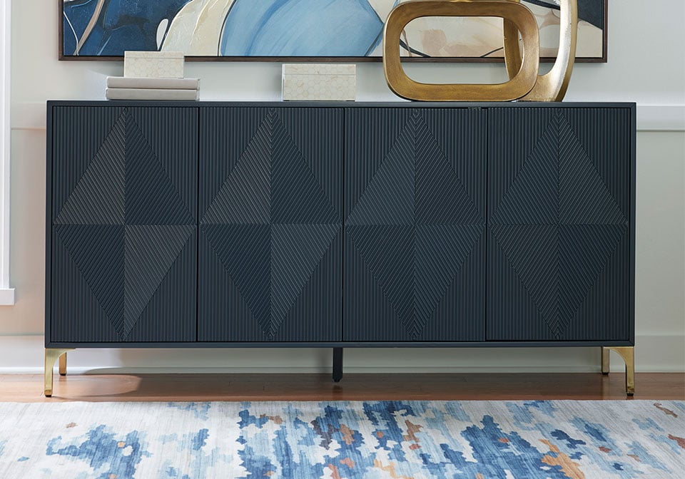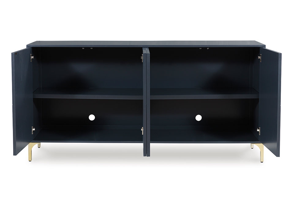 Elevate your aesthetic with the chic design of this accent cabinet. Sleek goldtone legs and striking doors with a geometric pattern infuse contemporary flair wherever you place this piece. Add a dark blue finish, and you’ve got a stunning showstopper. Providing function to form, the cabinet’s push magnetic doors reveal two shelves and openings for electronics.