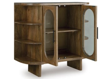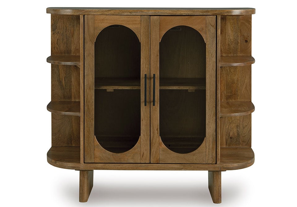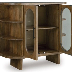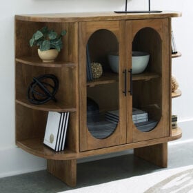 This accent cabinet puts a uniquely chic spin on a classic storage solution. It seamlessly blends clean lines with mid-century inspired curves, donning a light brown finish for that much more versatility. Exposed side shelves eagerly welcome your favorite decorative pieces, while additional shelves behind the glass-paneled doors offer ample storage.