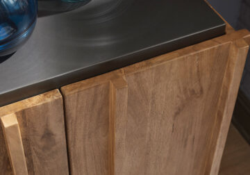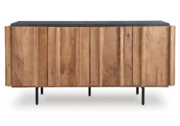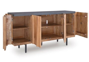 This striking accent cabinet offers a magnificently modern vibe with its high-low design and sleek metal legs. Bathed in an inviting light brown finish, it features a contrasting charcoal gray top for a touch of industrial chic. Four doors conceal fixed shelves, providing ample storage space. Convenient openings in the back allow for easy cord management.