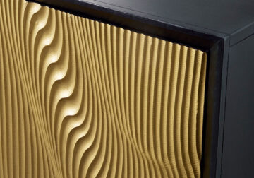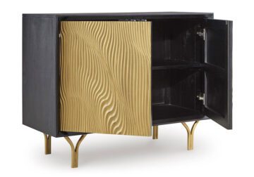 Style? Tons. Storage? Check. This accent cabinet adds more than just a contemporary cool design to your space. Finished in black and goldtone with a carved pattern on the door fronts, it conveys a sophisticated style that’s perfect for a bar area. Push magnet doors open to reveal a shelf. After a long day of adulting, let this piece help you mix up a little reward.