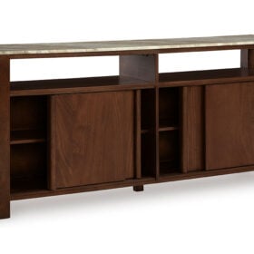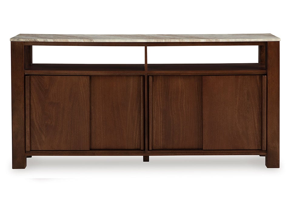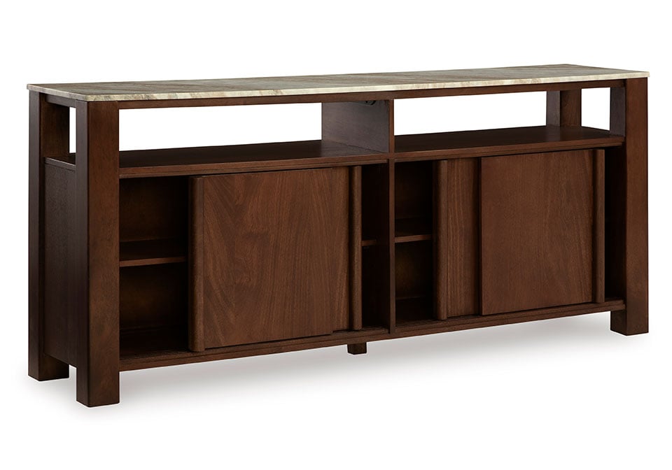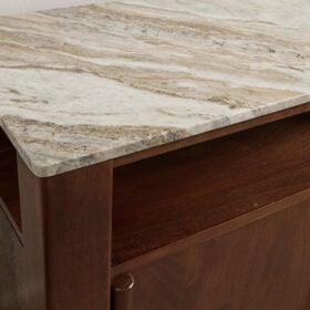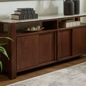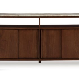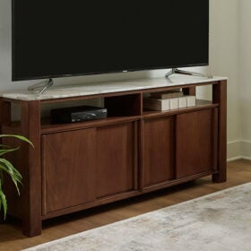High style and functionality? Check and check. This accent cabinet’s taupe, white and gray marble top and contrasting dark brown finish bring the wow factor. Sliding doors open to reveal shelves that are perfect for hiding everyday clutter. Whether you use it for storage or as a TV stand, this showpiece creates contemporary elegance with ease.