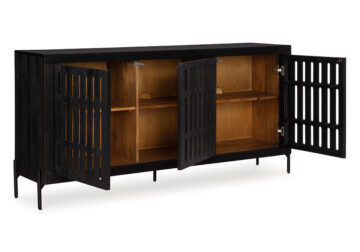 This accent cabinet showcases high-end style with a captivating design. A cleverly placed cutout offers a sneak peek inside, making it a versatile choice for use as a buffet, console or media cabinet. Contemporary and casual, this piece epitomizes laid-back luxury.