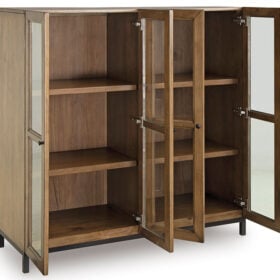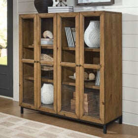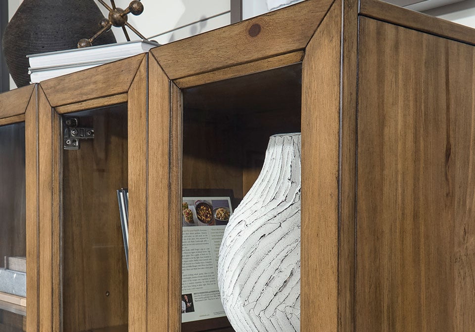 Versatile style teams up with must-have storage space. An elevated approach to the everyday, this accent cabinet is invitingly chic in a gray-brown finish. Soft-close hinges and adjustable shelving provide thoughtful functionality. Suiting spaces from casual to modern, this cabinet is equally chic in an entryway, living space or dining room.