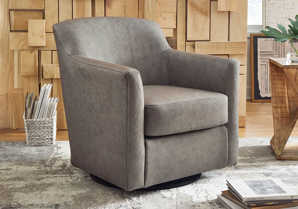 The classic leather club chair—reimagined with today’s sensibilities in mind. Beautifully scaled, amply padded and streamlined for a contemporary feel, this swivel accent chair is a versatile performer. Plus a mix of real leather and expertly matched faux leather keeps this stylish number well within budget. The only difference you’ll see is in the price.