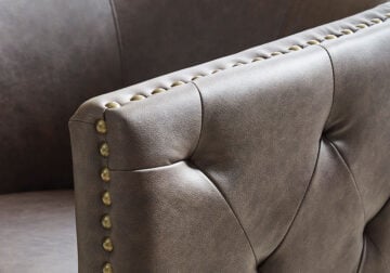 Complete your cozy reading nook or chic seating area with this swivel accent chair. Handsome with its dark faux leather upholstery, the seating is perched on a 360-degree swivel base for the perfect blend of style and function. Design details like tufted sides and antiqued brass nailheads complete the look with added flair.