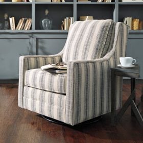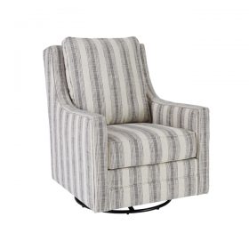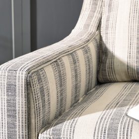 Accent Chair. Slope Arm. Upholstered in Ivory and Black Striped Patterned Polyester/Linen Blend Fabric. Loose and Reversible Pillow Back and Box Seat Cushion with Platform Seating Construction. Metal Swivel Glider Base.