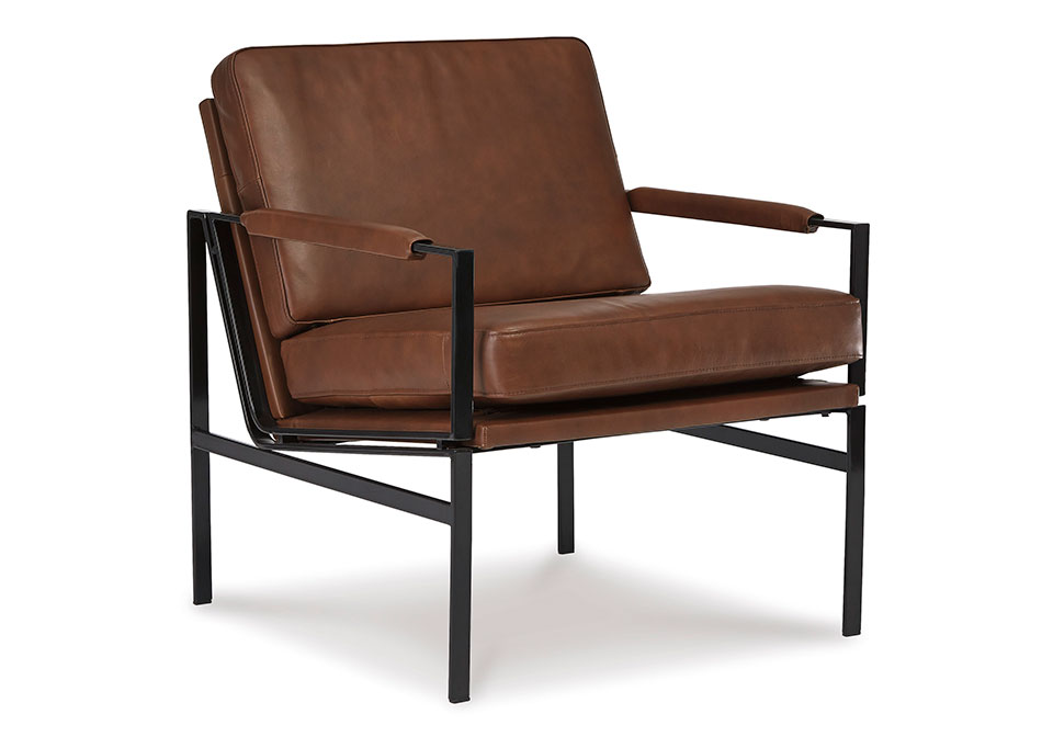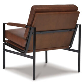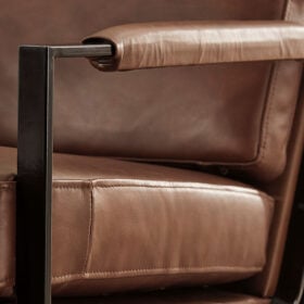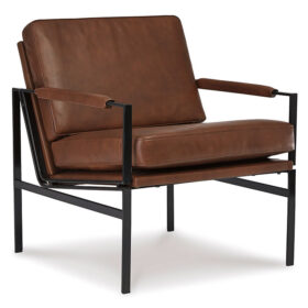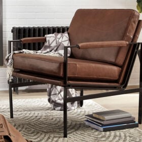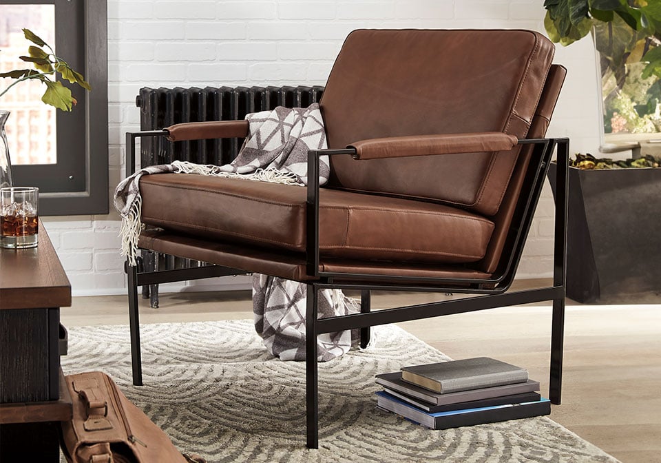 This accent chair has an ultra-modern vibe and indulgent feel. Its metal frame is a chic complement to brown leather seating. With its bronze-tone finish and urban industrial style, this accent chair impresses with high-end looks priced to entice.
