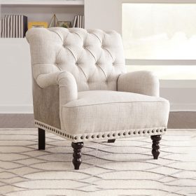 Fresh and sophisticated. This accent chair with button tufting is a classy addition to your home. Inside-out design with linen weave fabric on the seating area and taupe faux leather on the back. Large nailhead trim ties the look together. Charles of London arms and turned bun feet make this a stylish heirloom piece.