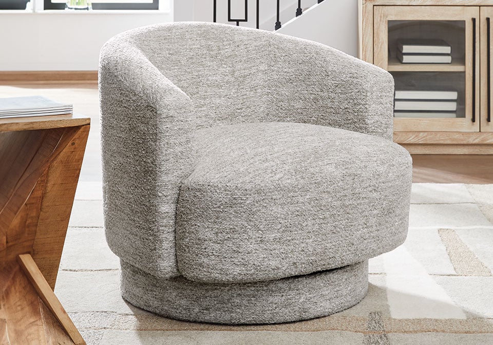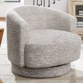 Relaxation meets refinement in this accent chair. With an ultra-soft fabric in a crisp, light neutral, it invites you to curl up in comfort. A 360-degree swivel provides added versatility. Drape a throw blanket over the back, or add an accent pillow for a pop of color—with this chair, the possibilities for cozy-contemporary style are endless.