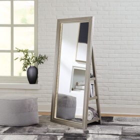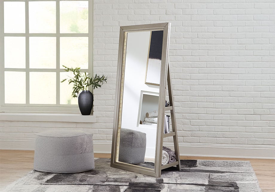 This floor mirror with storage makes on-the-go glam effortless. Complete outfits with accessories in an instant—with easy-to-access shelving on the back, you can keep all your favorites on hand. And last-minute makeup touchups are made easy with sleek LED lighting around the frame. With its contemporary styling, this mirror helps you look your best while keeping your home right on trend.