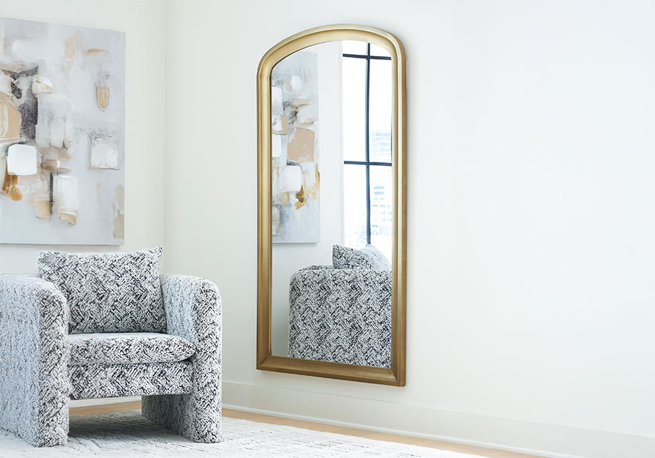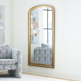 With a gracefully arching top dressed in a goldtone finish, this floor mirror embodies contemporary elegance. Its substantial scale wows, ushering in light and depth with a broad reflective surface. Be it in the entryway, living room or bedroom, it’s striking from every angle.