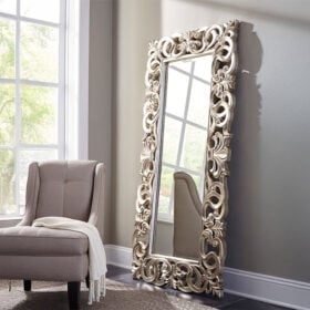 Exquisitely crafted for any glamour queen, this floor mirror is a splendid accent. Antique silver finish brings life to the ornate scroll design.