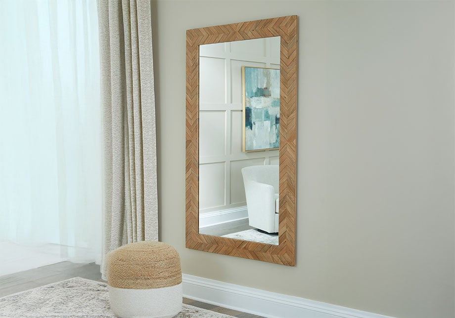 Simply striking and strikingly simple. With its clean lines and impressive stature, this floor mirror is a well-designed complement to your everyday routines. Its right-on-trend chevron pattern gives the warm and welcoming light brown finish a contemporary edge.