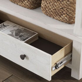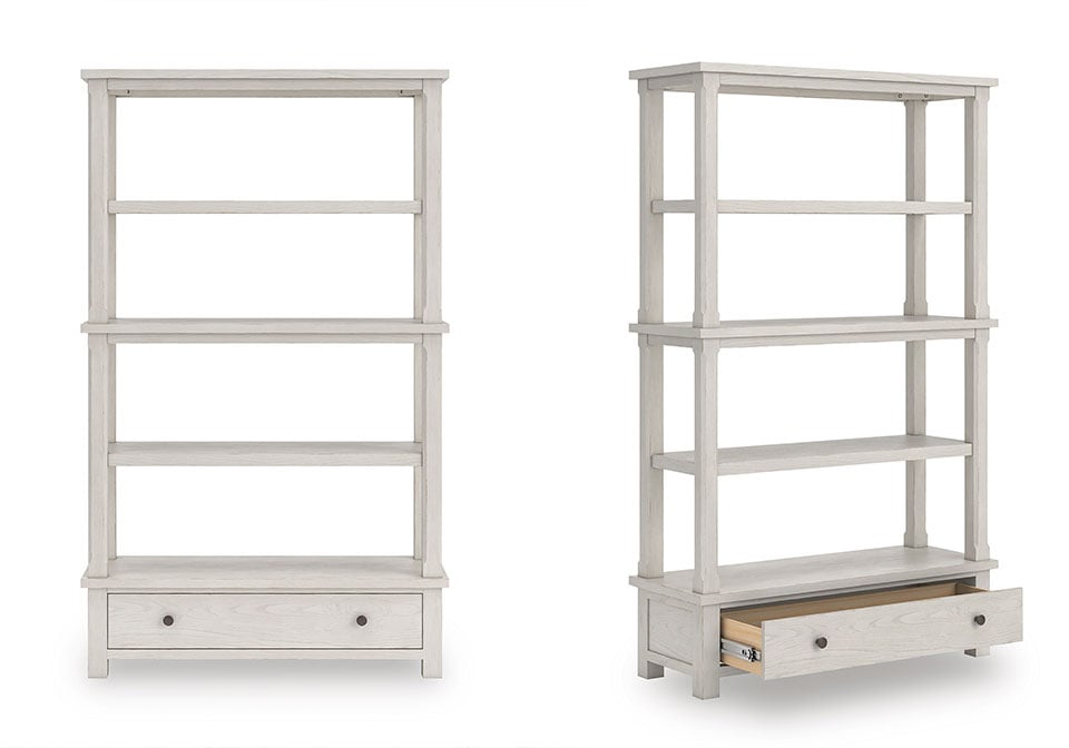 This bookcase is sure to impress when it’s time to study or work from home. With its antiqued white finish and wood grain texture, modern farmhouse-style workstations have never been so fashionable. The open four-shelf design is ideal for storage and displaying your treasures. And that large storage drawer brings even more function to your workspace. All that’s missing is you.