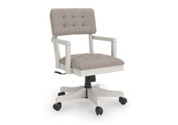 This home office desk chair is sure to impress when it’s time to study or work from home. With its antiqued white finish, cushioned seat and back covered in tufted light gray upholstery, modern farmhouse-style workstations have never been so fashionable. The adjustable seat allows you to find your sweet spot, while casters provide easy mobility. All that’s missing is you.