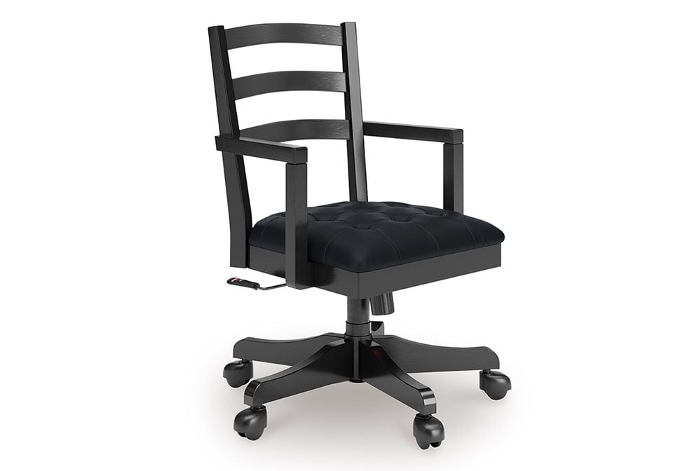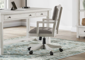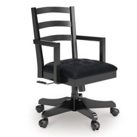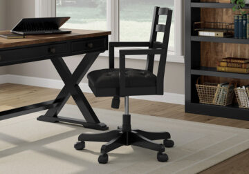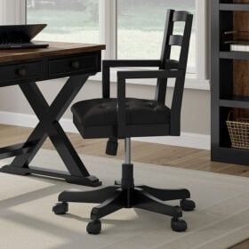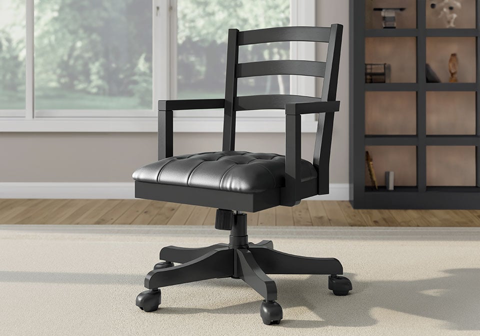 Raise the bar on modern farmhouse style with this home office chair. Its casual good looks are accentuated with a comfortably cushioned seat and warm satin black finish. And it swivels, rolls and adjusts so you can remain a mobile multitasker. Whether your style is vintage, country or eclectic, this richly crafted chair adds a hearty element.