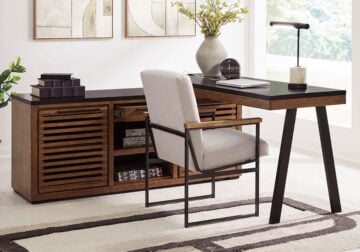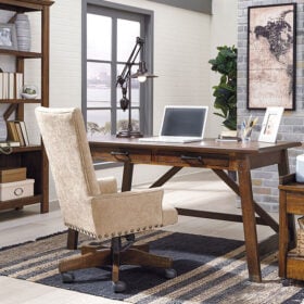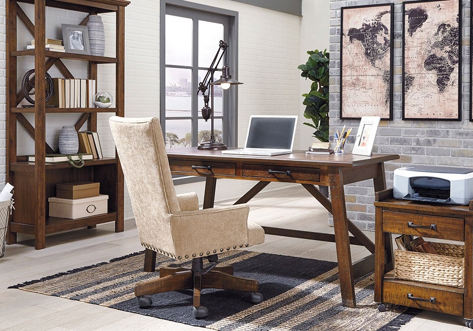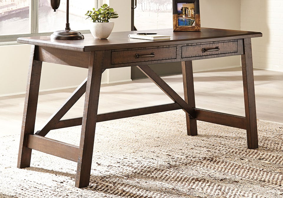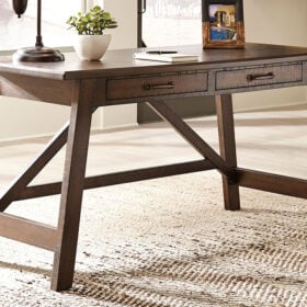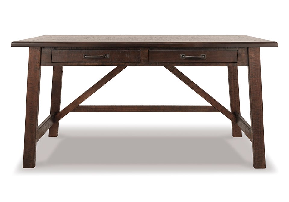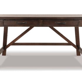 Leaning toward a casually cool look with a touch of rustic industrial flair? This home office desk with canted legs takes a fresh stance on style. Two smooth-gliding drawers with dovetail construction reflect high quality that never goes out of fashion. Saw marks infuse a touch of rich distressing. Antiqued sculptural pulls provide the finishing touch.