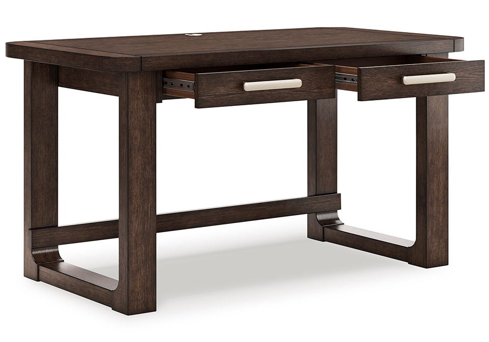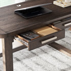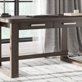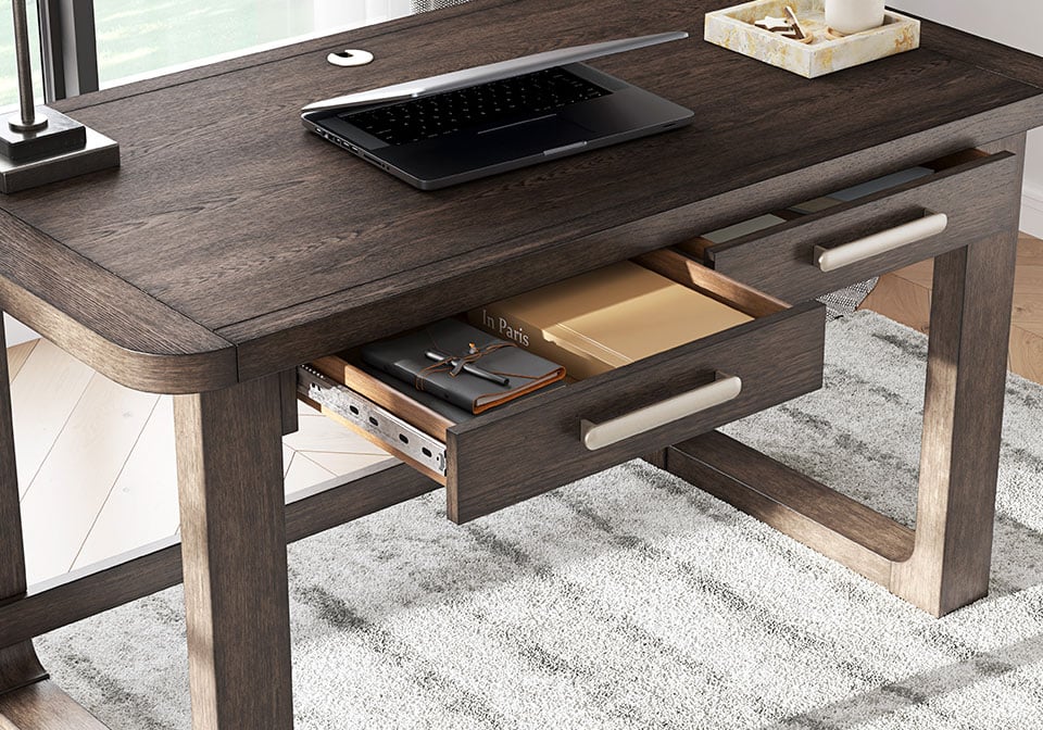 Classic meets contemporary in this home office desk. Its rich, dark wood tone and rounded corners suit today’s trends while balancing a timeless appeal. And with two storage drawers for work and study essentials, this desk gives your office a dose of both form and function.
