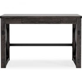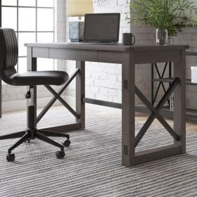 Love an urban farmhouse aesthetic? Make it work to your advantage with this beautifully styled desk. This simply striking choice in home office furniture has an unmistakable farmhouse feel thanks to design elements including a gray decorative wood grain laminate contrasted with cross-buck rails, metal accents and a stretcher in black. Perfect for office supplies, the desk includes a handy center drawer with hardware-less aesthetic to help keep your desk top clutter free