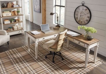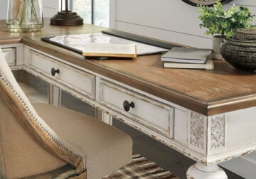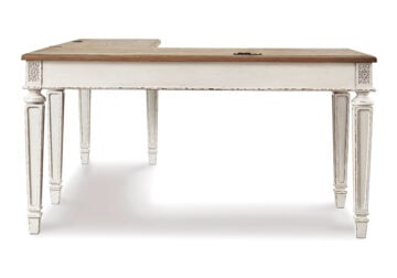 Elevating the art of traditional cottage styling, this L-shaped desk is your heavenly home office realized. Its two-tone finish combines chipped white with distressed wood tone tops for added charm. Framed drawer fronts, decorative corbels and elegantly turned and tapered legs add refinement, while dark bronze-tone knobs lend a classic touch.