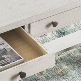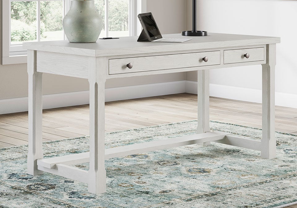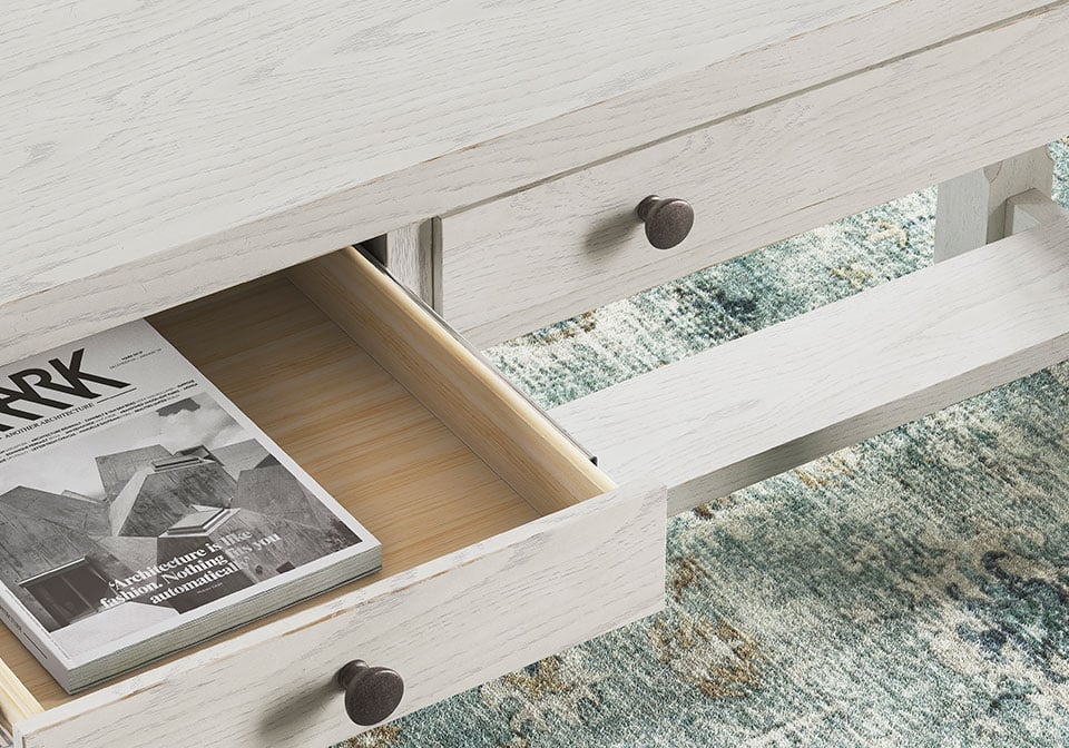 This home office desk is sure to impress when it’s time to study or work from home. With its antiqued white finish and wood grain texture, modern farmhouse-style workstations have never been so fashionable. A wide keyboard drawer and convenient USB charging bring function galore to your at-home office. Use this piece as a stand-alone work area, or pair it with the matching desk return (sold separately) to expand your workspace. All that’s missing is you.