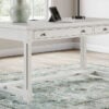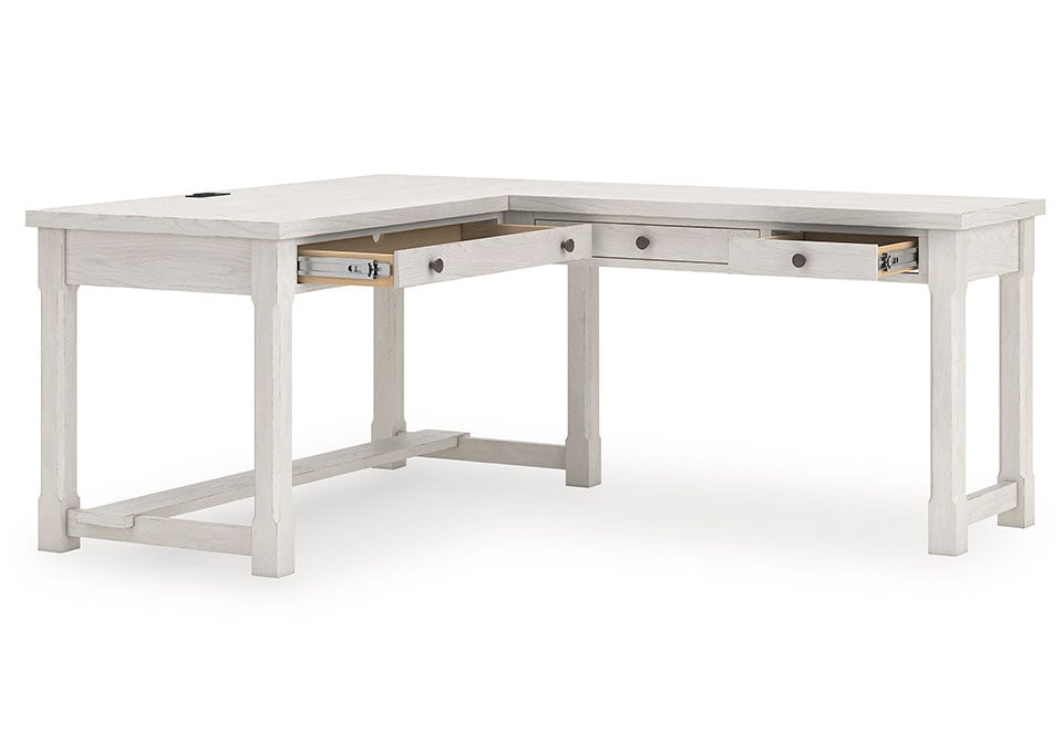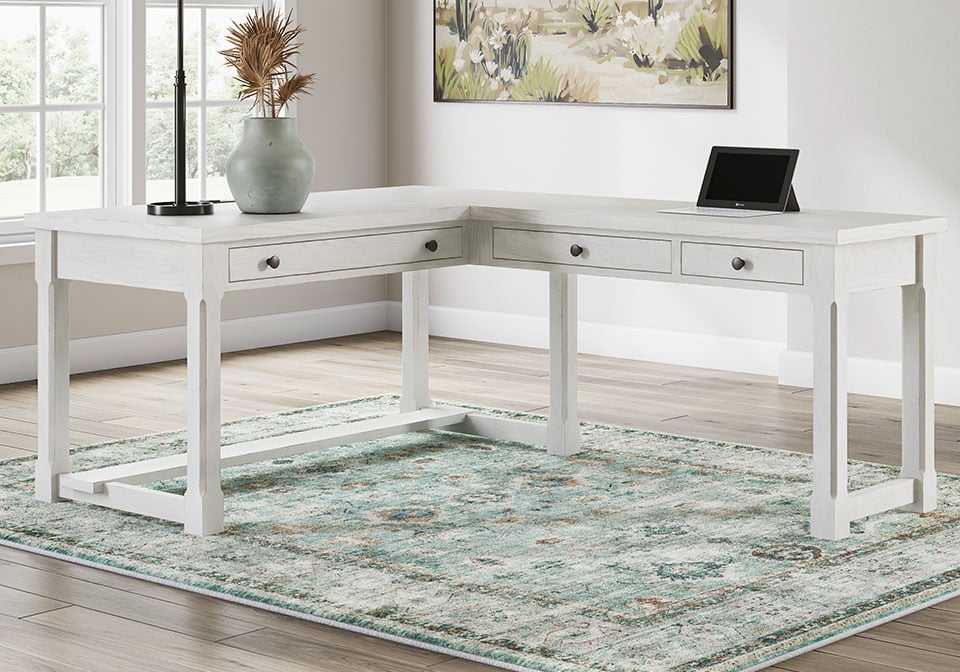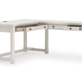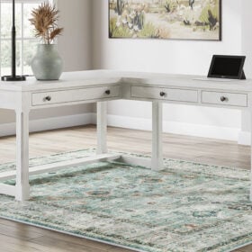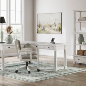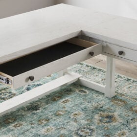 This L-shaped home office desk is sure to impress when it’s time to study or work from home. With its antiqued white finish and wood grain texture, modern farmhouse-style workstations have never been so fashionable. A wide keyboard drawer and convenient USB charging bring function galore to your at-home office. The desk return expands your workspace and adds spacious drawers to keep all your stuff organized. All that’s missing is you.