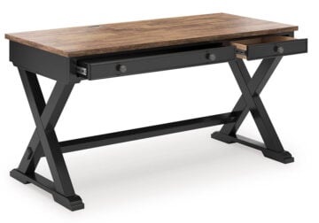 Raise the bar on modern farmhouse style with this home office desk. Its casual good looks are accentuated with a two-tone finish, which pairs a warm satin black base with a contrasting butcher block veneer desktop. The drop-down keyboard and cord management raceway bring both form and function to your at-home workspace. Use this desk as a stand-alone work area, or combine it with the matching desk return (sold separately) to create a larger work surface.