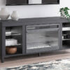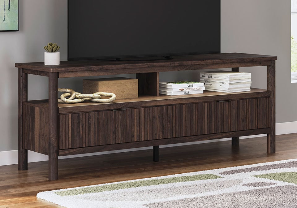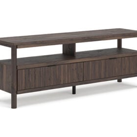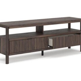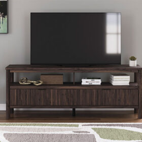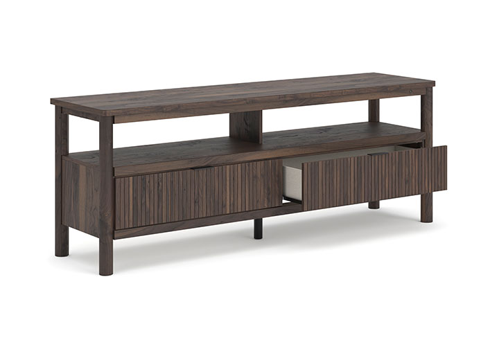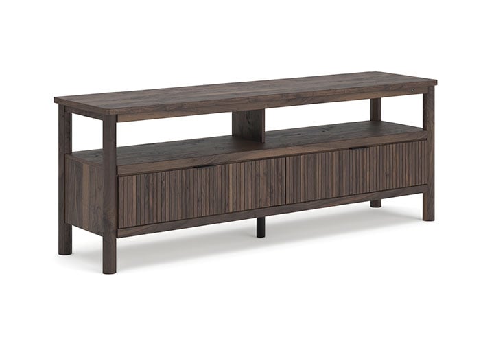 Crafted with both form and function in mind, this TV stand brings a dash of retro-cool character to your modern boho aesthetic. A reeded design on its drawers adds an on-trend touch to storing entertainment essentials. Warmly welcoming with a rich brown finish, the TV stand pairs well with muted hues, earth tones and other neutrals alike. And for added ambiance, lighting under the top brings a cool vibe to your favorite shows or video gaming. What a refined take on easygoing style.