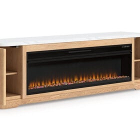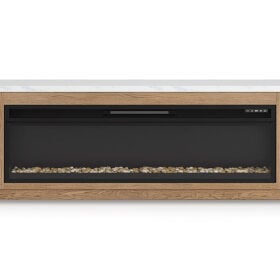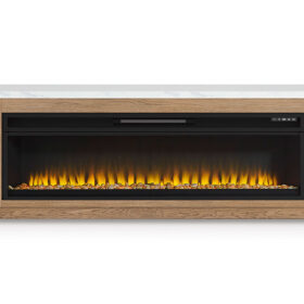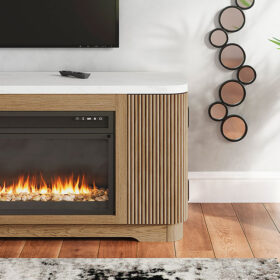 Elegance meets earthy charm in this TV stand with electric fireplace. Crafting a contemporary living room? The faux marble top expertly pairs with the reeded base for a trend-right take on day-to-day function. Open shelving and subtly integrated storage cabinets make it easy to store and display media accessories in style. For your added viewing pleasure, the wide fireplace insert gives you the cozy feel of a fireplace without the added hassle. With the touch of a button, adjust the temperature and the color-changing flames, and set the timer for long-lasting enjoyment. It comes with faux glass crystals and natural stones, so you can customize the look of the flame bed.