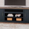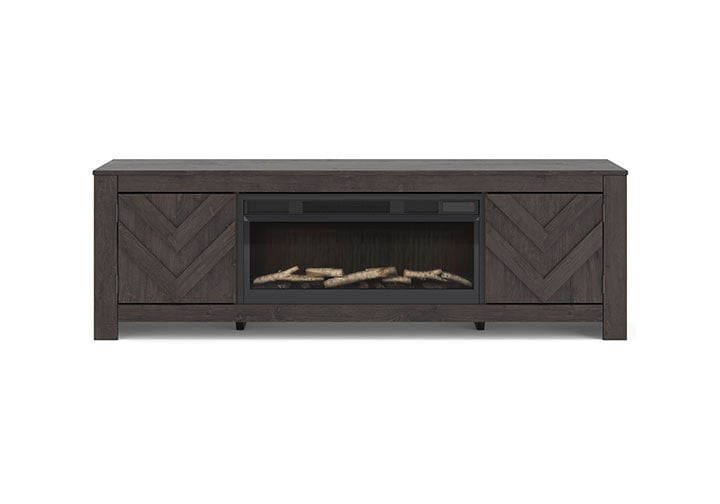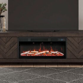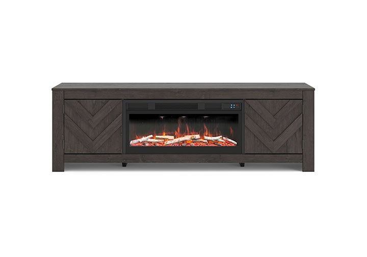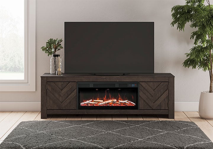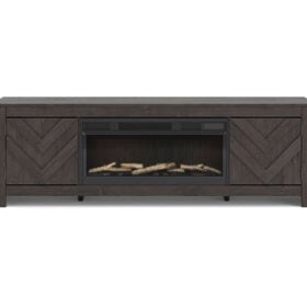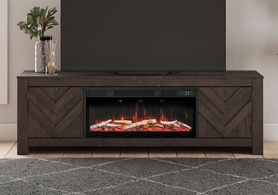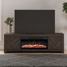 This TV stand with electric fireplace embraces a classically charming aesthetic and repurposes it for modern living. Its dark charcoal finish appeals to your love of vintage character, while a chic chevron pattern is effortlessly on trend. Media accessories stay tucked away in style thanks to hidden storage behind the doors. And for added ambiance, the electric fireplace brings a cozy-cool vibe to your living room. With the touch of a button, activate the LED-lit flame and adjust the temperature or the flame brightness. The flame effect includes multiple color options and a realistic-looking faux birch log set.
