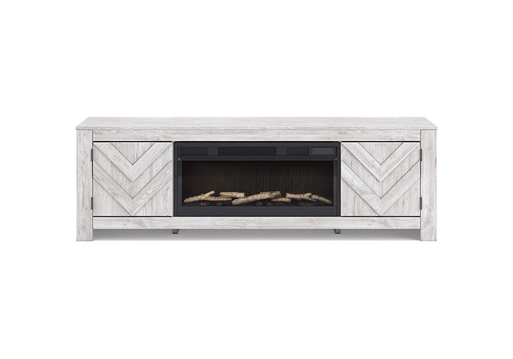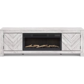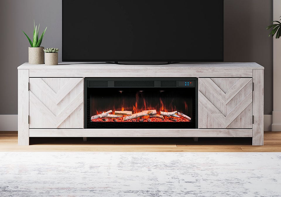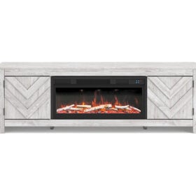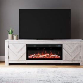 This TV stand with electric fireplace embraces a classically charming aesthetic and repurposes it for modern living. Its whitewash replicated paint appeals to your love of vintage character, while the chic chevron pattern is effortlessly on trend. Media accessories stay tucked away in style thanks to hidden storage behind the doors. And for added ambiance, the electric fireplace brings a cozy-cool vibe to your living room. With the touch of a button, activate the LED-lit flame and adjust the temperature or the flame brightness. The flame effect includes multiple color options and a realistic-looking faux birch log set.
