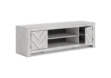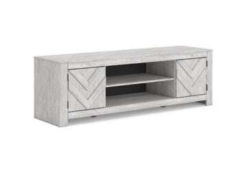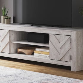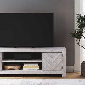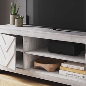 This TV stand embraces a classically charming aesthetic and repurposes it for modern living. Its whitewash replicated paint appeals to your love of vintage character, while the chic chevron pattern is effortlessly on trend. And with hidden storage behind the doors, your media accessories stay tucked away in style.
