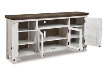 Have your fill of modern farmhouse style with this TV stand. Its distressed two-tone finish pairs a vintage white with a weathered gray for a look that’s utterly charming. Right and left cabinets open to reveal adjustable shelving for all your entertainment center storage needs. Center glass doors add to its relaxed appeal.