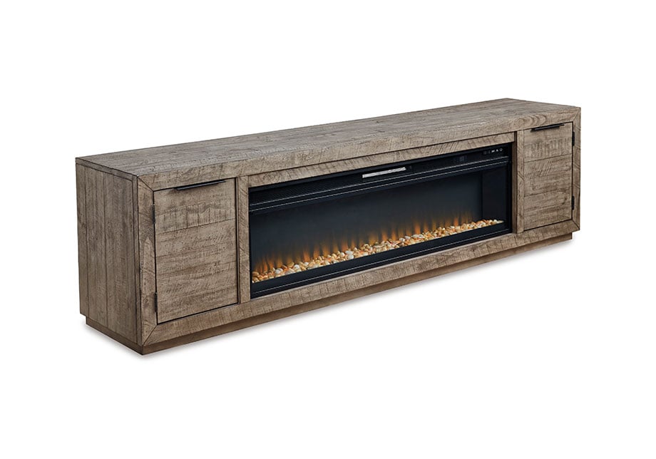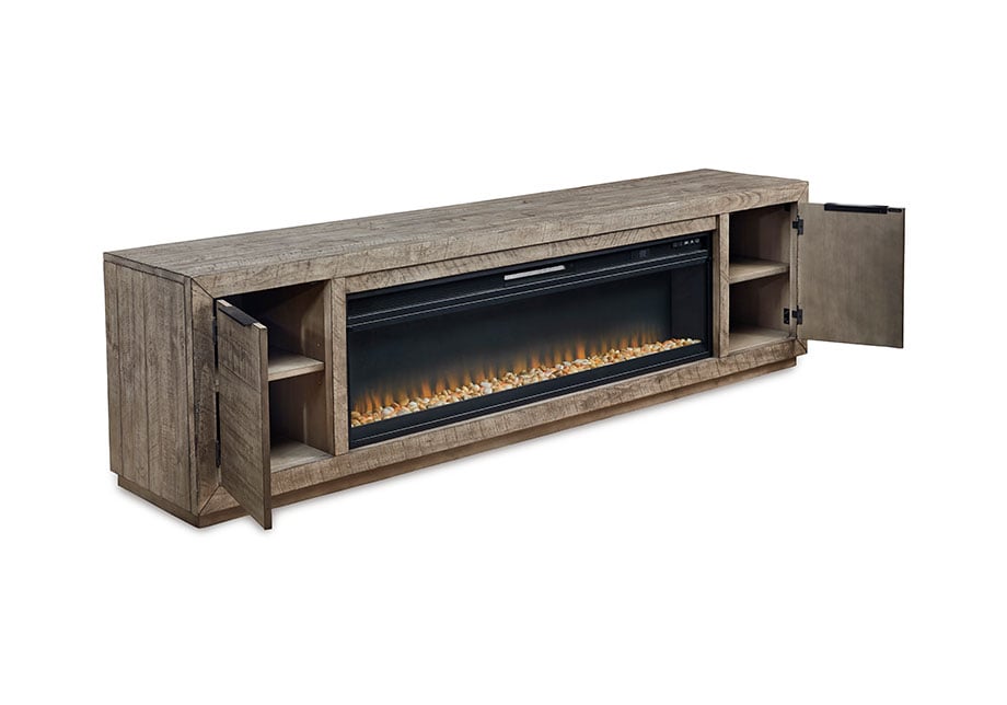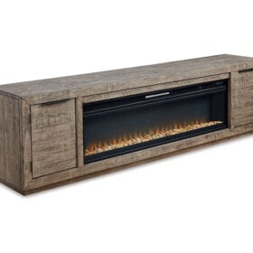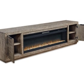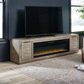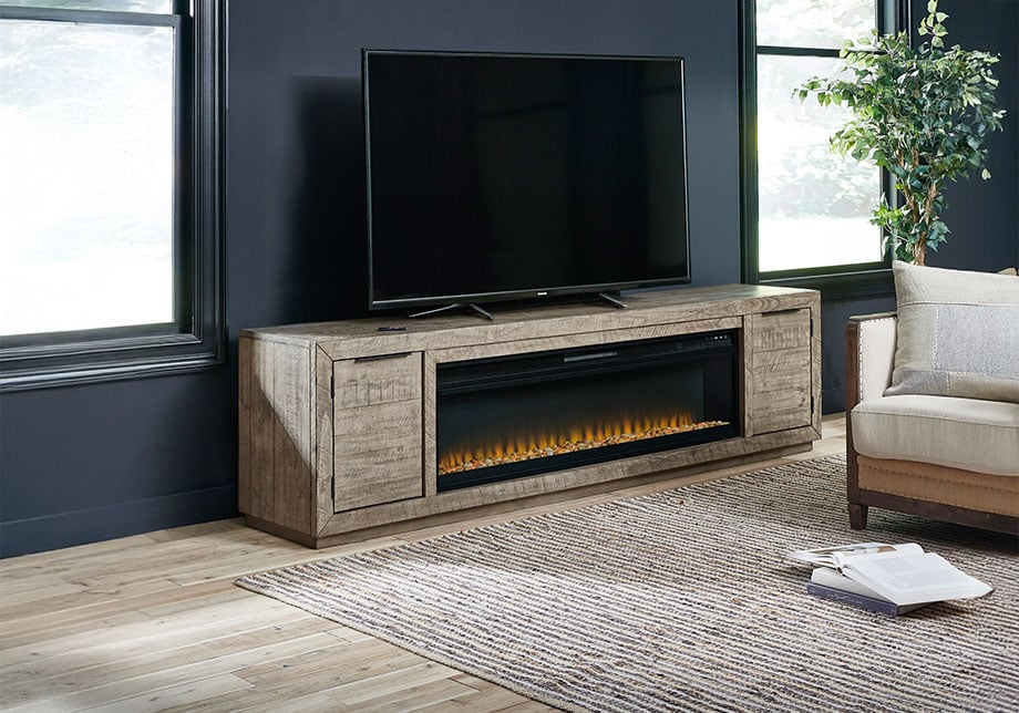 This extra-large TV stand with fireplace insert is sure to win your heart with its daring take on modern rustic expression. Its crisp, clean minimalist-chic profile is enriched with striking pine wood grain and a weathered gray finish with distressed saw mark texture. For your added viewing pleasure, the wide fireplace insert gives you the cozy feel of a fireplace without the added hassle. With the touch of a button, adjust the temperature and the color-changing flames, and set the timer for long-lasting enjoyment. It comes with faux glass crystals and natural stones, so you can customize the look of the flame bed.