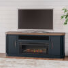 This TV stand combines casual contemporary design with modern appeal. Its combination of a thick-bodied wood-tone top with a slate blue cabinet is a smart choice on so many levels. Stow away electronics in the roomy cabinets, and use the upper shelf to conceal a soundbar speaker for a clean integrated look. Enhancing the experience: the optional fireplace insert (sold separately) brings a touch of warmth and beautiful ambiance to your living room.