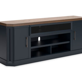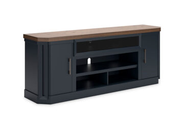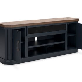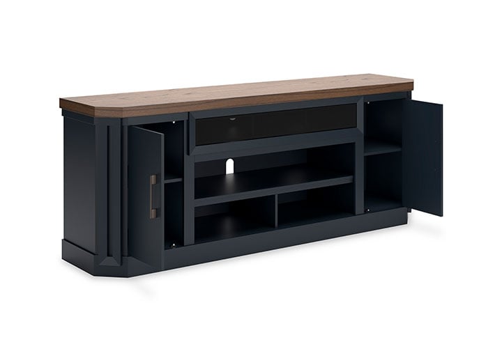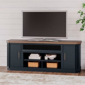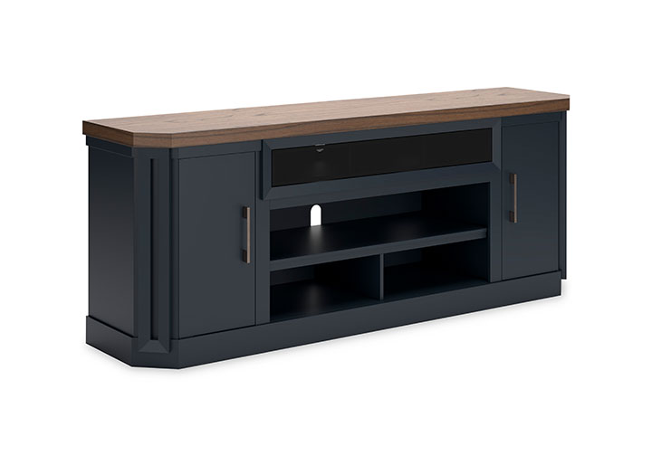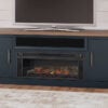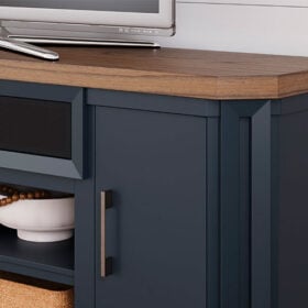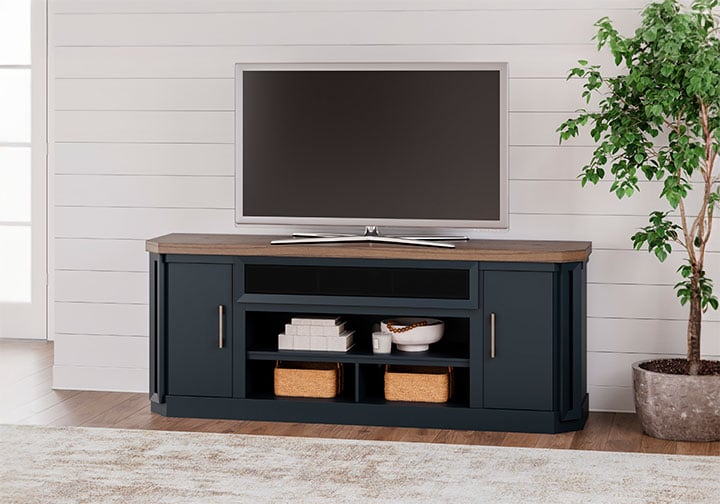 This TV stand combines casual contemporary design with modern appeal. Its combination of a thick-bodied wood-tone top with a slate blue cabinet is a smart choice on so many levels. Stow away electronics in the roomy cabinets, and use the upper shelf to conceal a soundbar speaker for a clean integrated look. Enhancing the experience: the optional fireplace insert (sold separately) brings a touch of warmth and beautiful ambiance to your living room.