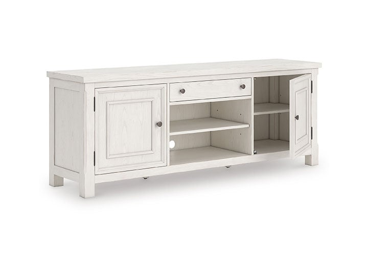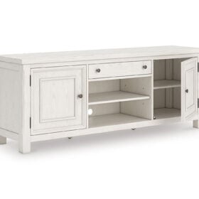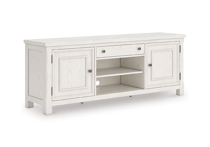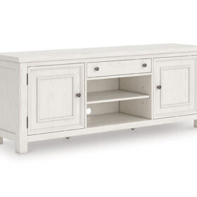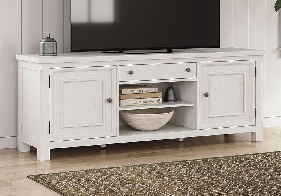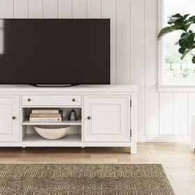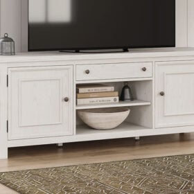 This TV stand is sure to impress when it’s time to relax after a tough day. With an antiqued white finish and wood grain texture, modern farmhouse-style design has never been so fashionable. Its cabinets and adjustable shelves are ideal for keeping all your equipment well organized and displaying your treasures. And that storage drawer is perfect for smaller accessories, bringing even more function to your entertainment space. All that’s missing is you.