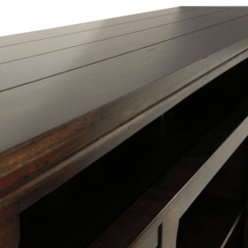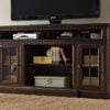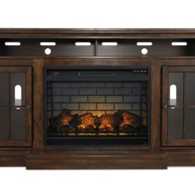The beauty of this TV stand will immediately engage you. Its slight breakfront shape is a rare find and an ideal fit among traditional and eclectic tastes. Soft black undertones highlight the warm finish. Multiple cubbies and glass-door enclosed shelves organize your audio/video components and plenty of extras. And what really turns up the heat: an electric infrared fireplace insert with faux firebrick surround that operates with or without infrared heat. With the touch of a button, adjust the temperature and the flame brightness, and set the timer for long-lasting enjoyment.