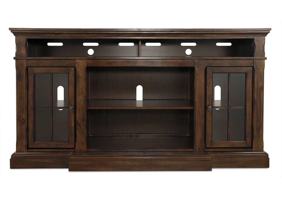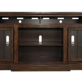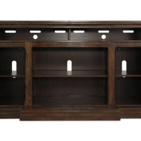 The beauty of this TV stand will immediately engage you. The slight breakfront shape is a rare find and an ideal fit among traditional and eclectic tastes. Soft black undertones highlight the warm finish. Multiple cubbies and glass-door enclosed shelves organize your audio/video components and plenty of extras. Sold separately, an electric fireplace fits neatly in the center cubby.